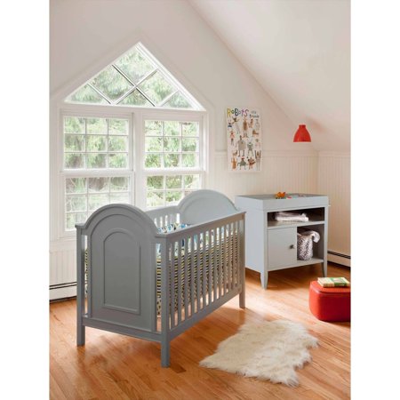 Lolly and Me Ellery 4-in-1 Fixed Side Convertible Crib, Grey: Raised moldingsDramatic arched end panelsModern linesAdjustable mattress pad accommodated 3 heights for a growing toddlerTransitions from crib to toddler bed, daybed or full size bedSafety boltsThick slatsStyle that's fresh, functional and safeConversion kit sold separately at www